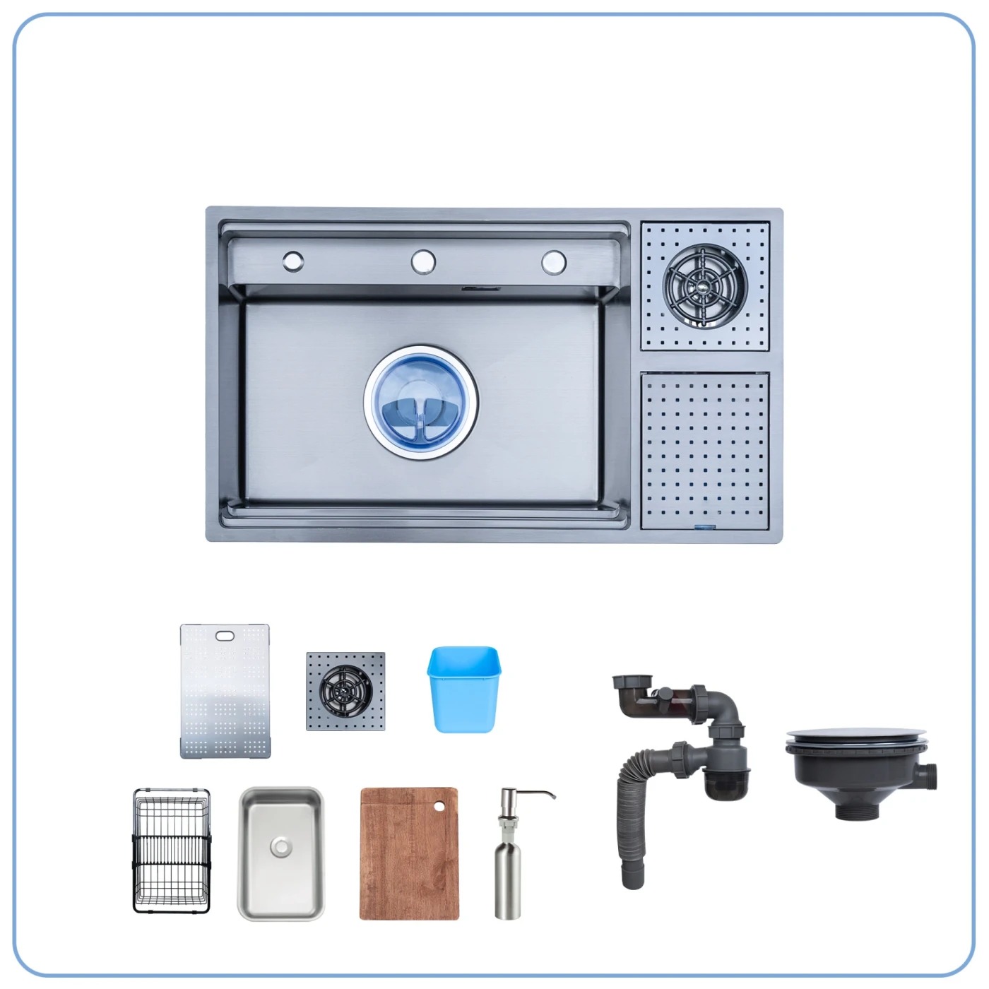 Gồm: Thớt gỗ + Xịt cốc + Hố rác + 2 Tấm đậy + Rổ LK + Khay LK + Bình đựng nước rửa bát