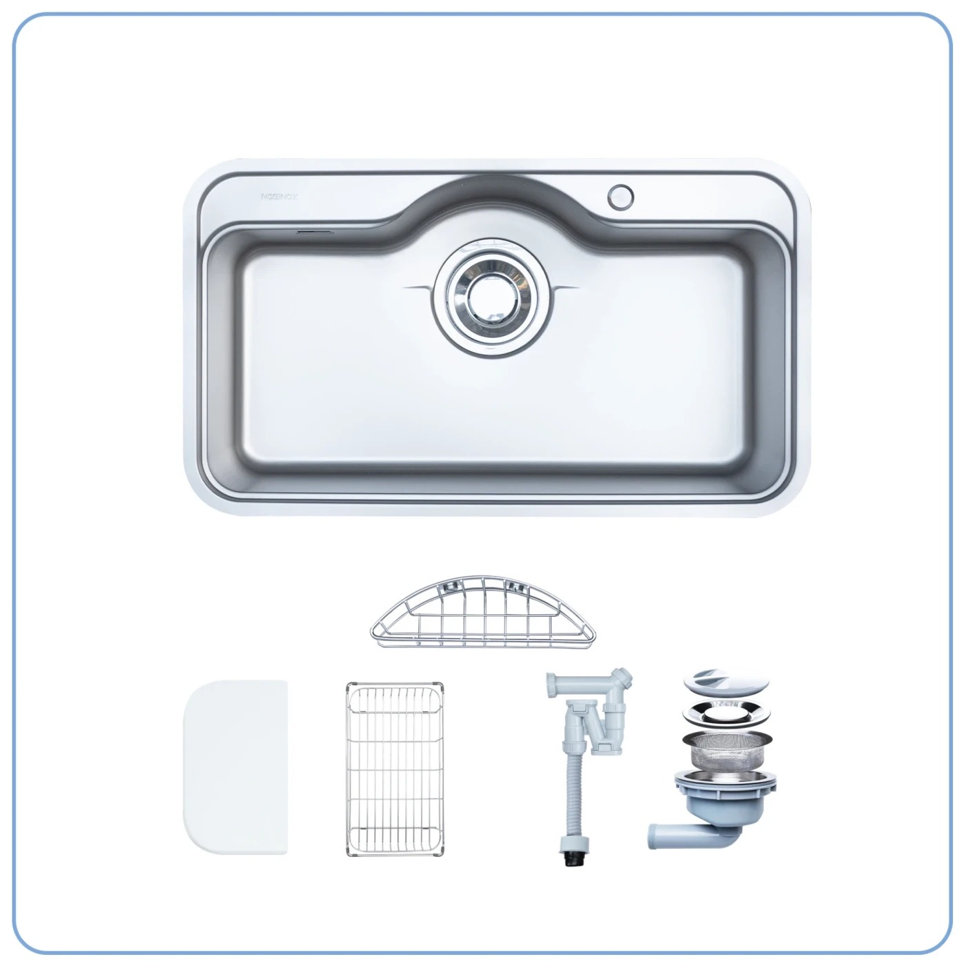 Nobinox ROSA NN995D – mẫu chậu 1 hố phong cách Nhật, sở hữu thiết kế tối giản thanh lịch và kích thước lớn 880×500 mm. Hoàn thiện từ Inox 304 POSCO sáng bóng, bền bỉ, cùng bề mặt vân siêu mịn chống xước, chậu mang đến vẻ đẹp cao cấp và độ bền vượt trội. Lòng chậu sâu 220 mm hỗ trợ rửa xoong nồi cỡ lớn thoải mái, kèm phụ kiện thớt và rổ LK giúp tối ưu hóa không gian gian bếp.