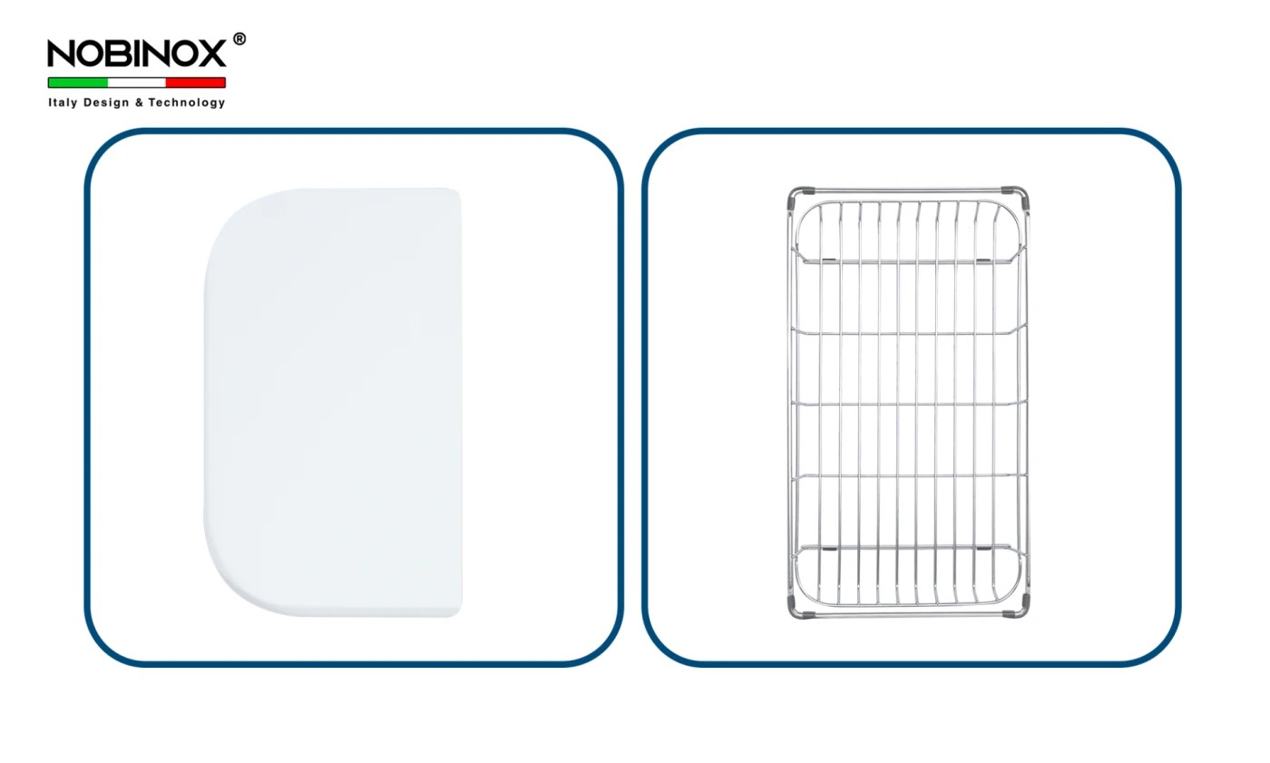 Phụ kiện đi kèm: thớt nhựa, rổ LK – tiện lợi và gọn gàng.