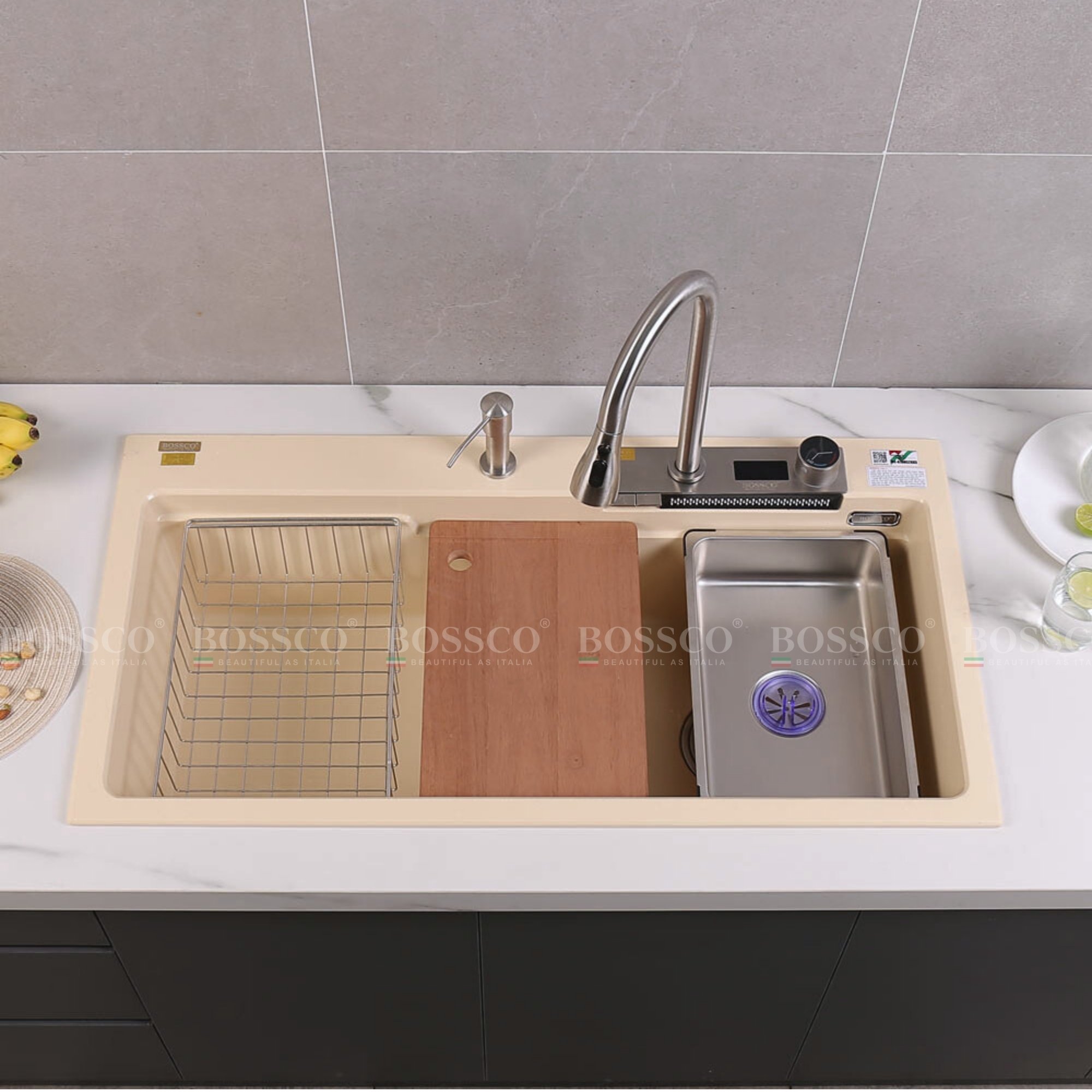Chậu rửa chén đá Bossco BC-A10052KKS ( Kem kim sa). KT : 1000*520*250mm. 1 hộc, 2 phím đa năng