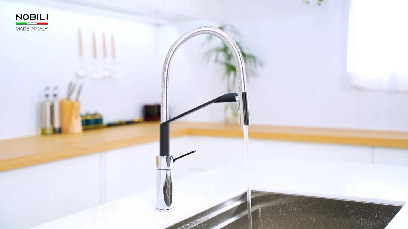 Thiết kế cần mềm uốn cong, kết hợp đầu vòi bằng lò xo mang lại sự linh hoạt và sang trọng.